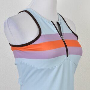 Stretch ribbed material. Sleeveless. Lower back opening. Pullover. Front bust zipper. Scoop back.