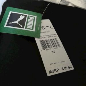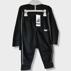 This puma set is a 2 piece set. Comes with a black and white jacket with full zip up front, pockets, mock neck collar, and puma graphic on front. Pants have an elastic waist made as a solid black pant featuring a white puma logo on front and white stripe down sides of legs finishing in a ribbed ankle cuff.