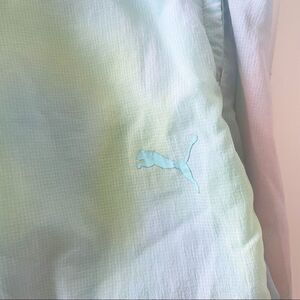 These Puma lightweight pants feature a high rise, elastic waistband, side welt pockets, tapered leg, low crotch, semi-sheer fabric with shorts lining inside.