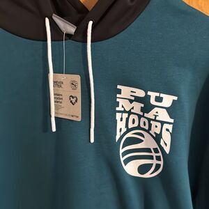 This is new with tags. The color is emerald green and black. The fabric is 66% cotton, 34% polyester. Fleece lined. The chest is 50 inches, 25 flat. The length is 30 inches. The sleeves are 27 inches. This is oversized for basketball.