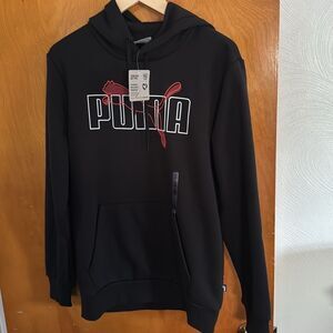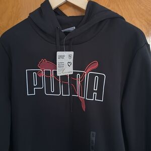 This is new with tags. The color is black. The fabric is 66% cotton, 34% polyester. Fleece lined. The chest is 42 inches, 21 flat. The length is 28 inches. The sleeves are 26 inches.