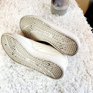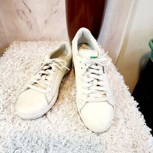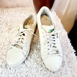 Excellent condition no flaws almost new Puma all white leather tennis shoes with white lace up style Size 7 super comfy go with everything!