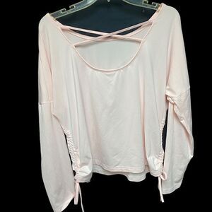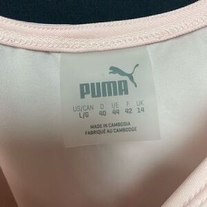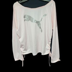 New without tags. Has adjustable drawstrings on both sides to create ruched crop top effect. Powder pink with silver PUMA cat logo. Please see flat measurements below for fit.