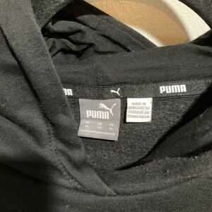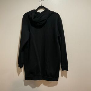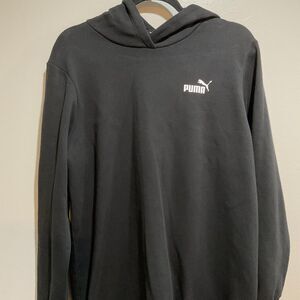 Puma fleece hoodie sweater dress in black, women’s size small. Features long sleeves, hooded neckline, and cozy cotton-blend fleece. Made in Bangladesh.