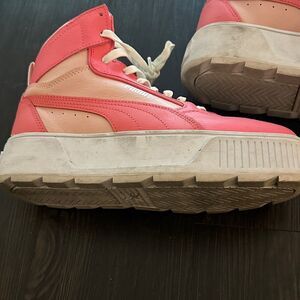 Vibrant coral sneakers with white accents. Comfortable and stylish for women active wear. Not new and only been worn a few times.