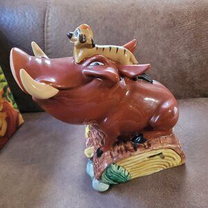 Vintage Music Box Pumbaa & Timon 1994 The Lion King. It plays Hakuna Matara. There are no known chips or cracks, measures approx 6.5'' tall, comes in original box that show wear and has been taped.