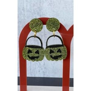 Are you nostalgic for your childhood & getting that plastic pumpkin candy bucket to go trick or treating with? We have created the same one into glitter earrings. You choose between the green or purple colors.
