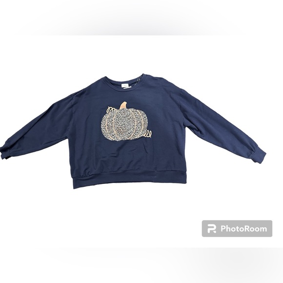 Excellent pre-owned condition. Fall themed crew neck sweatshirt. Shorter length. Pumpkin animal print detail.