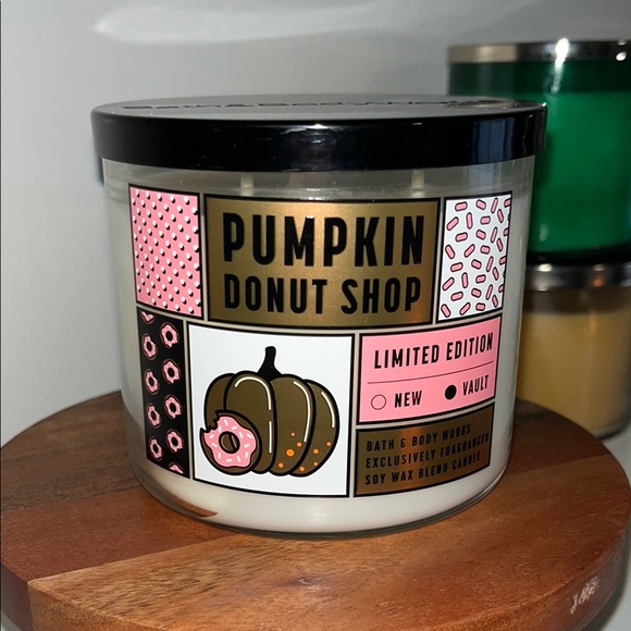 New, never used candle in the scent Pumpkin Donut Shop from Bath & Body Works. Special edition vault packaging. Selling off my candle collection.