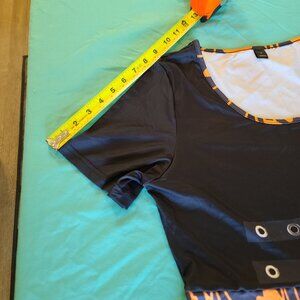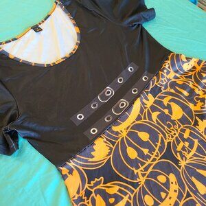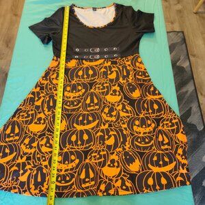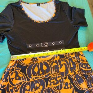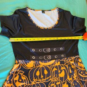 Women's Halloween Dress. Labeled as Medium, but more like a Large. Stretchy polyester material. Black and orange with printed belt and pumpkin design. New without tags, never worn.