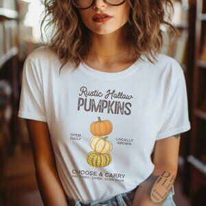 Welcome pumpkin season with this adorable vintage style graphic tee featuring a varied pumpkin harvest in a farmers market style. This graphic tee with a touch of vintage autumn is the perfect addition to your fall wardrobe. This casual white short sleeve crew neck t-shirt is made from a soft and lightweight polycotton fabric for a soft and comfortable feel.