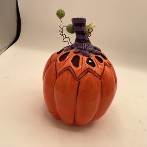 Halloween pumpkin made of ceramic. Holds a T-lite and ight comes through the face and holes in the lid. Purple stem with sickly green leaf and berries. Made in China in 2004 for Blue Sky under Crayworks.