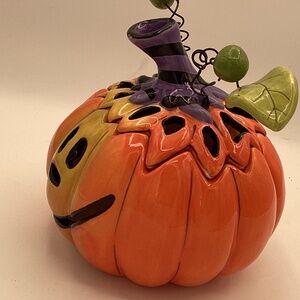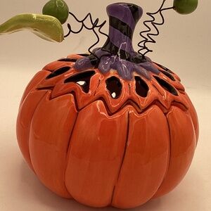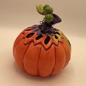 Pumpkin Happy Face T-Lite Holder by Blue Sky Clayworks. Has a smile and icky green leaves. It has a spot of unripened pumpkin on the space and a purple stem. 4 inches in diameter.
