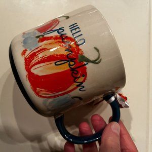 This is a listing for a ceramic mug with a pumpkin theme from Lang Designs. It features a hand painted pumpkin design on one side and a smaller pumpkin on the back. A miniature pumpkin detail sits at the top of the handle for added charm. The mug measures approximately 4 inches in diameter.