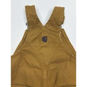 This product is a Carhartt Baby 18 month Classic Tan Bib Overalls in excellent condition. Made from 100% cotton canvas, these sleeveless overalls feature a square neckline and a solid brown color. Perfect for casual occasions in the winter, fall, or spring, these overalls are machine washable and have a classic farm theme. The iconic Carhartt logo accents add a stylish touch to this unisex baby and toddler garment.