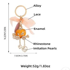 Whimsical pumpkin carriage key chain with pearl accents and tag that states “believe.” Bring a little magic to your look or buy as a gift for someone else.