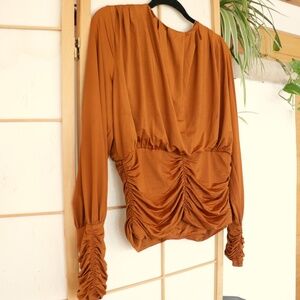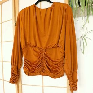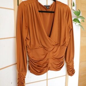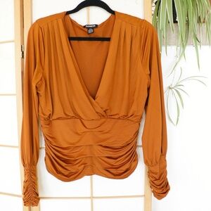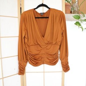 Billowy, ruched wrap blouse with deep neckline and the most perfect pumpkin spice color for autumn