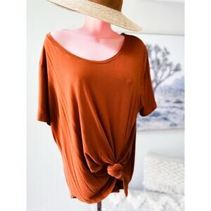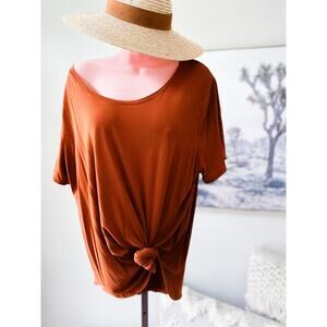 Like golden leaves tumbling in October, this pumpkin-hued tee was made for cozy days and effortless charm. Crafted in the softest slouchy knit, it drapes gently for a relaxed silhouette or ties sweetly in a front knot for a bit of playful shape. With its scoop neckline and easygoing fit, it’s the kind of piece you’ll reach for when comfort and character are both on the mood board. Perfect for morning strolls, candlelit reading hours, or afternoons spent collecting daydreams.
