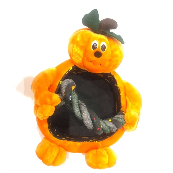 This beuatiful basket is made out of a furry orange material with a beautiful expresive face and the little hands hold a curved handle made out of materials in metalic silver, green and spooky eyes. The center is lined with a material that is black with Boo! in orange and other spooky eyes. This can either be a center piece at the Halloween decoration table and also extend to the Fall holidays with flowers or other decor inside. This can also be a very special halloween candy basket. This basket is very big and cannot be combined with another big item. Only items that can fit inside the basket can be bundled.
