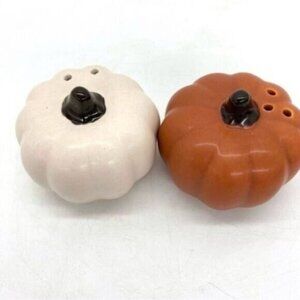 One orange and one cream ceramic pumpkin salt & pepper shakers set. New. 2 1/2” tall, 3” in diameter.