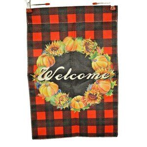This Unbranded 12 x 18 inch double sided burlap garden flag features a vibrant design of pumpkins and sunflowers. The red flag, made of weather resistant nylon, warmly welcomes guests.