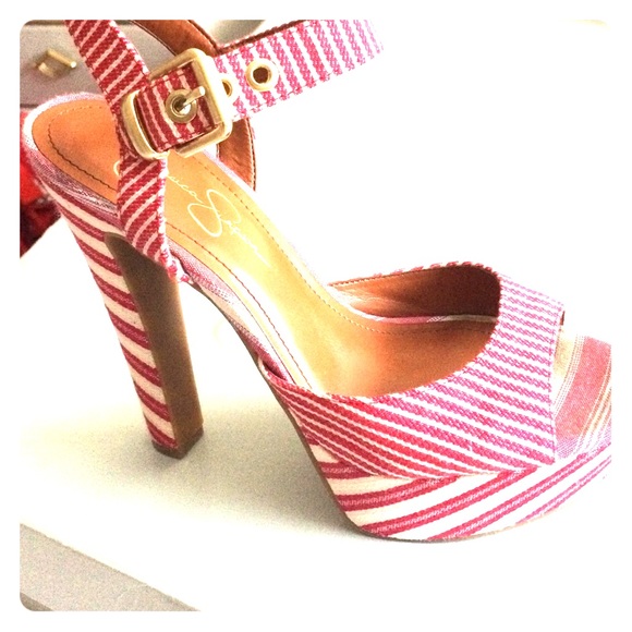 JS-PAPAYA RED NEWPORT STRIPE red and white striped 5" heel 1" platform worn once