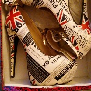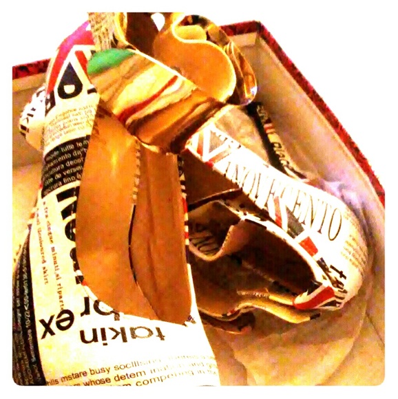 These shoes were worn once they look like newspaper articles with the flag and a gold bangle as the front strap