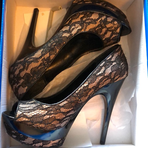 Champagne and black lace heels worn once