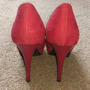 Red, suede type material. Platform style, stiletto heels. Minimal wear, slight scuffing on toes. Size 8.5