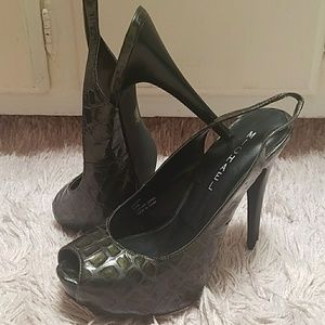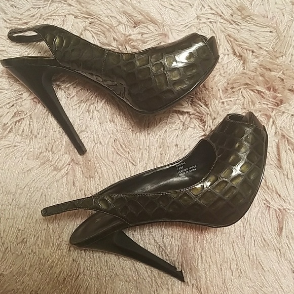 Michael brand. Patent leather alligator Pewter Green. Small platform. Never worn. Box thrown away. Closest to asking price.