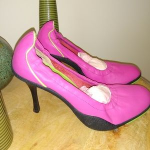 Hot Pink pumps, round toe with neon green trim. Comfortable & slightly worn.
