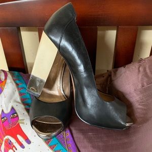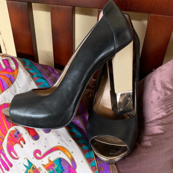 BCBG never worn! fabulous for so many outfits. Black leather with oak wool and chrome heel. Size 6. Perfect condition. Great Great find.