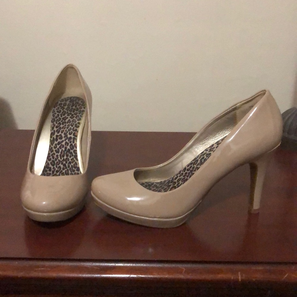 Beige pumps. Have foot inserts for comfort that can be easily removed if needed. True to size.