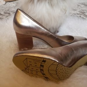 Soft gold leather pumps with stacked wooden 3 1/4 in. heels. Never worn. Size 9 1/2
