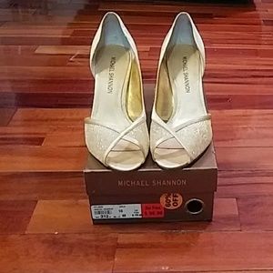 Gold Satin D'orsay pumps. A gold glitter mesh open toe pump. 4" stiletto heel. Barely worn Felisha pump from Michael Shannon. Size 10 medium width.