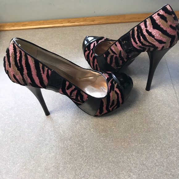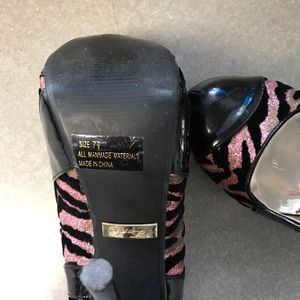 Glittery pink, tan, and black zebra print; fabric texture; fits snug so may fit a size 7 foot just fine; 4-1/2 inch heel