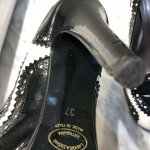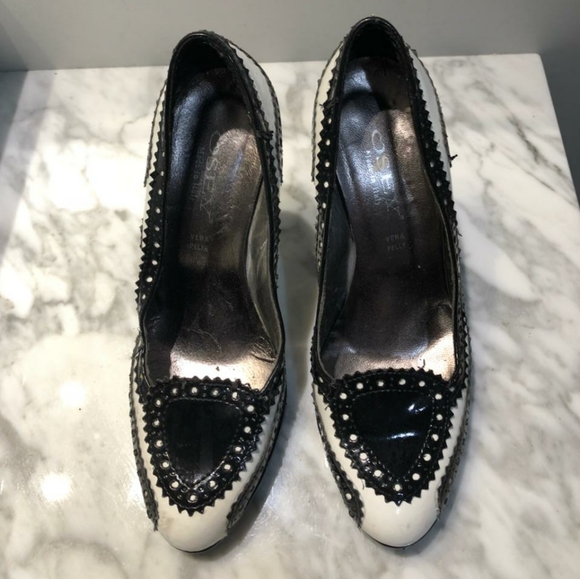 Selling a pair of Osey brand brand made in Italy Black and white patent leather pumps with 3 to 4 inch heel size 37 which is a seven in good condition