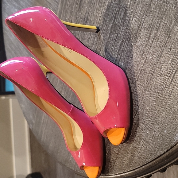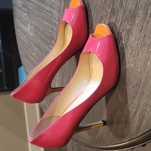 Pink,orange, and yellow pumps ...has a black scuff on bottom of right pump