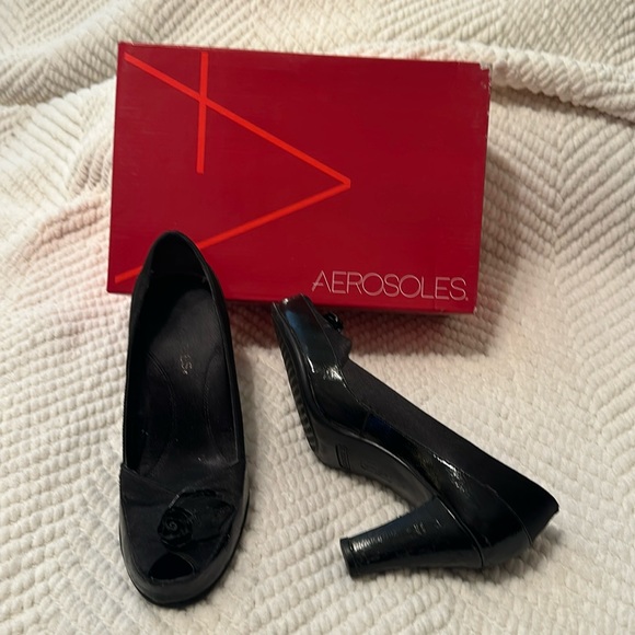 Aerosoles pumps, 8.5M. Small open toe with rosette leaf design. Fabric upper, some indentations on heels but not through material.