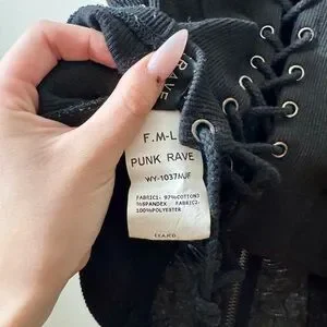 I bought this piece in Spain, mostly wore it out to techno parties. Size S/M. Honestly could go for any emo/goth/punk/rave look. I love this piece so much, it does ride up the waist a bit but looks stellar with knee high platform boots & a mini skirt ❤️🔥