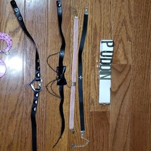 In this set you will receive 2 chains one with a skull with wings, the other a dragon on a crystal ball. You will get one pair of pink skulls and crossbones earrings. 5 chokers, one is Harley Quinn inspired, one is a bow with chains, one is a heart shaped o ring, one is a velvet pink o ring, and lastly one with a cross.
