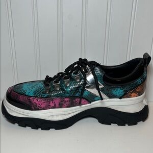 Step out in style with these vibrant women's platform sneakers. Featuring a mix of teal, pink, and yellow hues, these shoes are perfect for adding a pop of color to any outfit. Enjoy comfort and fashion combined