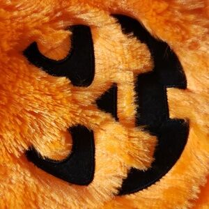 Bright orange plush with pumpkin face and stem with leaves as hood