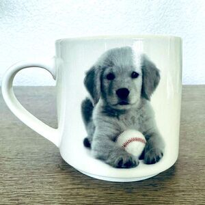 Adorable ceramic baseball yellow lab or Golden retriever puppy dog graphic mug in unused condition. Has a chip along the top as shown. Not visible from the opposite side, can be used as coffee bar decor, planter or vase for greenery.