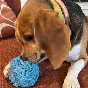 Interactive toys engage pups in a way that requires action, decision-making, and responses. This snuffleball entices dogs, using their sense of smell, to find hidden treats within the folds. By stimulating their curiosity and rewarding them for their foraging behavior, the toy encourages dogs to actively search and solve the puzzle, providing both mental and physical interaction during playtime.