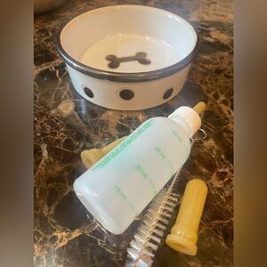 Puppy Baby Dog Set! Includes bottle with nipples and cleaner, a size small puppy harness for puppy walks, & a dog bowl! 7