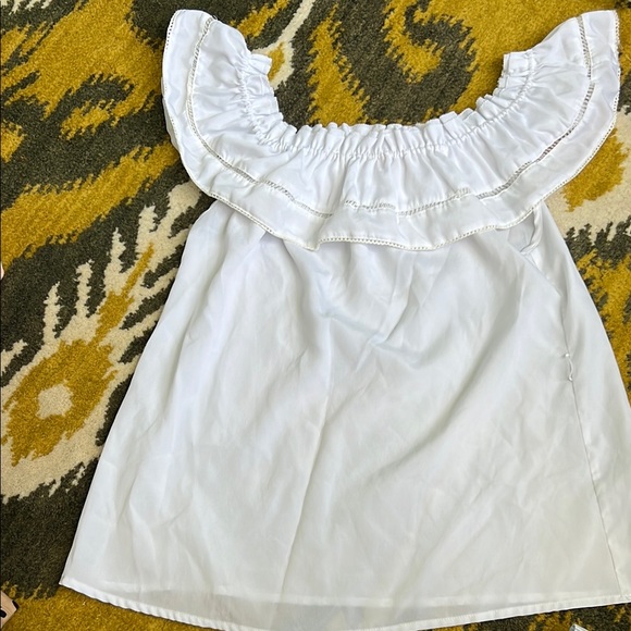 Elegant white top with ruffle accents. Ideal for casual wear. Tie sash included off the shoulder or regular.