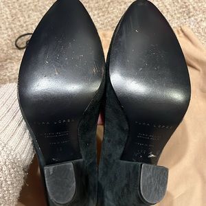 Only tried on indoors, beautiful shoes, excellent quality, dark green suede
