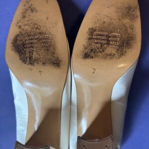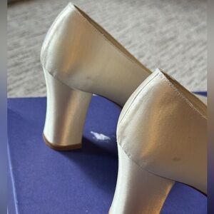 Gorgeous vintage silk and leather Pura Lopez cream heels with squared toe and block heel. Size 7/ 37.5 with a 3” heel. Made in Spain. Satin texture/ finish. Perfect wedding heels!