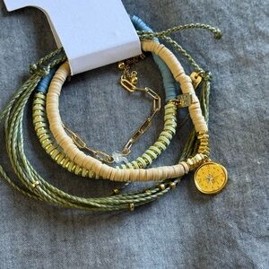 This bracelet set features a blend of gold, blue, green, and tan colors, super fun to add to any outfit. New with tag, bundle with other items in my closet to save on shipping.